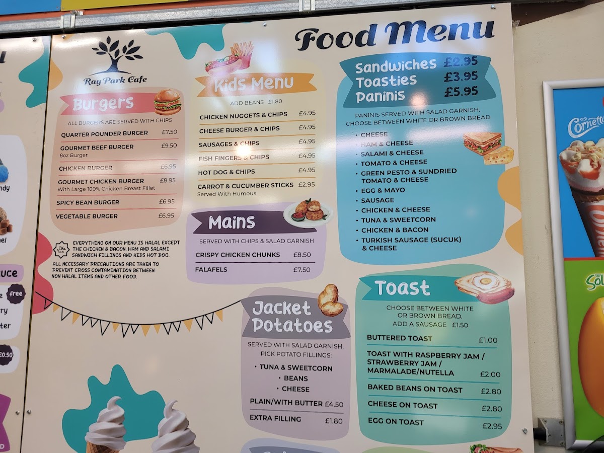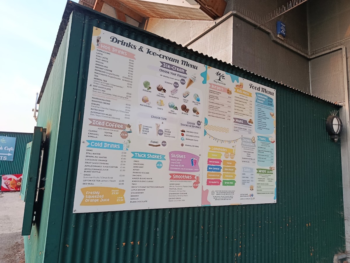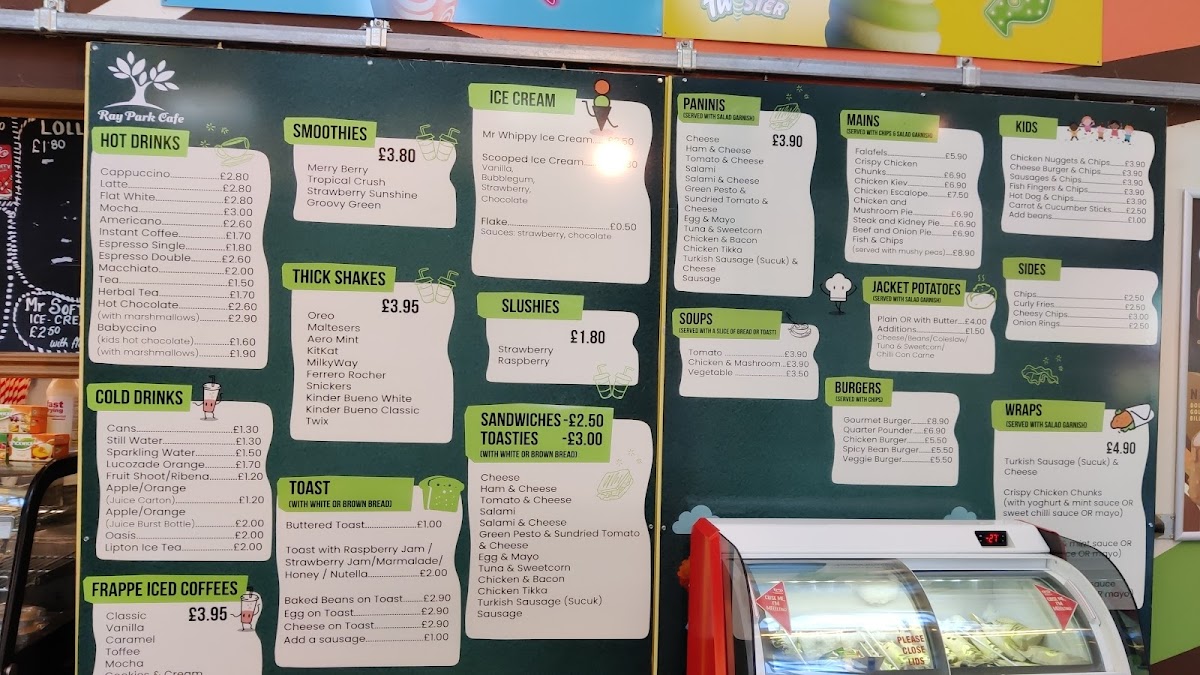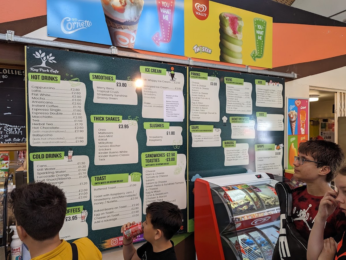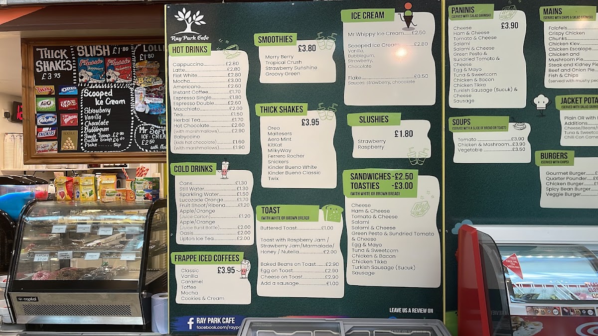 From a reviewer’s perspective, the menu at Ray Park Cafe feels like a well-rounded conclusion to everything you would want from a friendly local café, bringing together comfort food, quick bites, and indulgent treats in one cohesive offering. The drinks selection sets the tone with refreshing Cold Drinks such as Cans, Still Water, Sparkling Water, Lucozade Orange, and Fruit Shoot, alongside vibrant Smoothies like Merry Berry, Tropical Crush, Strawberry Sunshine, and Groovy Green. For those craving something richer, the Thick Shakes-including Oreo, Maltesers, Aero Mint, Kitkat, and Milkyway-add a playful, indulgent edge. Simple café classics shine through the Toast options, from Buttered Toast and Toast With Raspberry Jam / Strawberry Jam / Marmalade / Honey / Nutella to heartier choices like Baked Beans On Toast, Egg On Toast, and Cheese On Toast. Sweet cravings are easily satisfied with Mr Whippy Ice Cream and fruity Slushies in Strawberry and Raspberry. Savoury snacks are well represented with Toasties such as Cheese, Ham & Cheese, Tomato & Cheese, Salami, and Salami & Cheese, mirrored by equally tempting Paninis with the same comforting fillings. Warming Soups-Tomato, Chicken & Mashroom, and Vegetable-lead naturally into satisfying Mains like Falafels, Chicken Kiev, Chicken Escalope, Chicken And Mushroom Pie, and Steak And Kidney Pie. The Burgers section, featuring Gourmet Burger, Quarter Pounder, Chicken Burger, and Spicy Bean Burger, adds crowd-pleasing variety, while the Kids menu keeps things simple and reliable with Chicken Nuggets & Chips, Cheese Burger & Chips, Sausages & Chips, Fish Fingers & Chips, and Hot Dog & Chips. Coffee lovers are well catered for with Hot Drinks such as Cappuccino, Flat White, Mocha, Instant Coffee, and Espresso Double, complemented by Frappe Iced Coffees in Classic, Vanilla, Caramel Toffee, and Mocha. Finally, the menu rounds off neatly with flavourful Wraps like Turkish Sausage (Sucuk) & Cheese and Crispy Chicken Chunks, plus familiar Others including Latte and Americano, making the overall menu feel complete, approachable, and thoughtfully balanced.