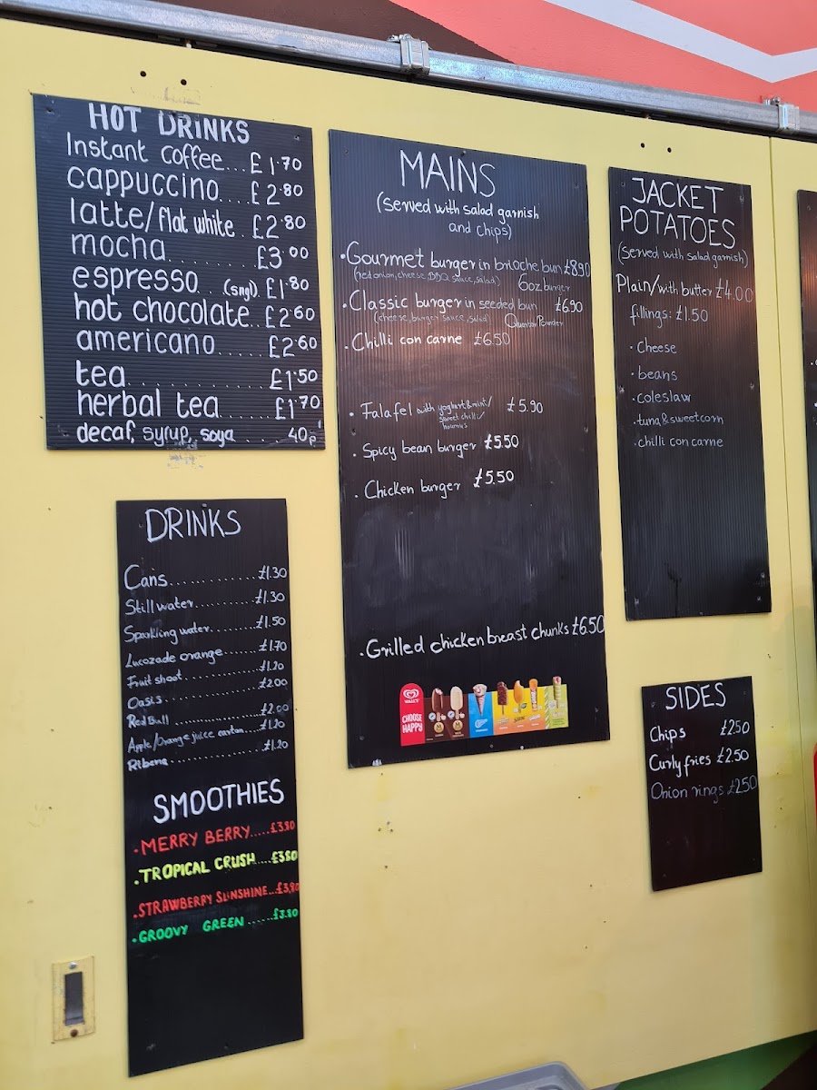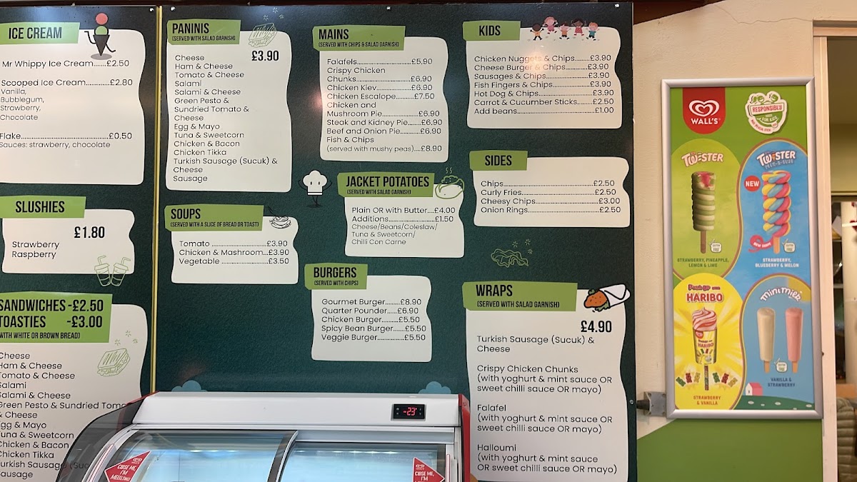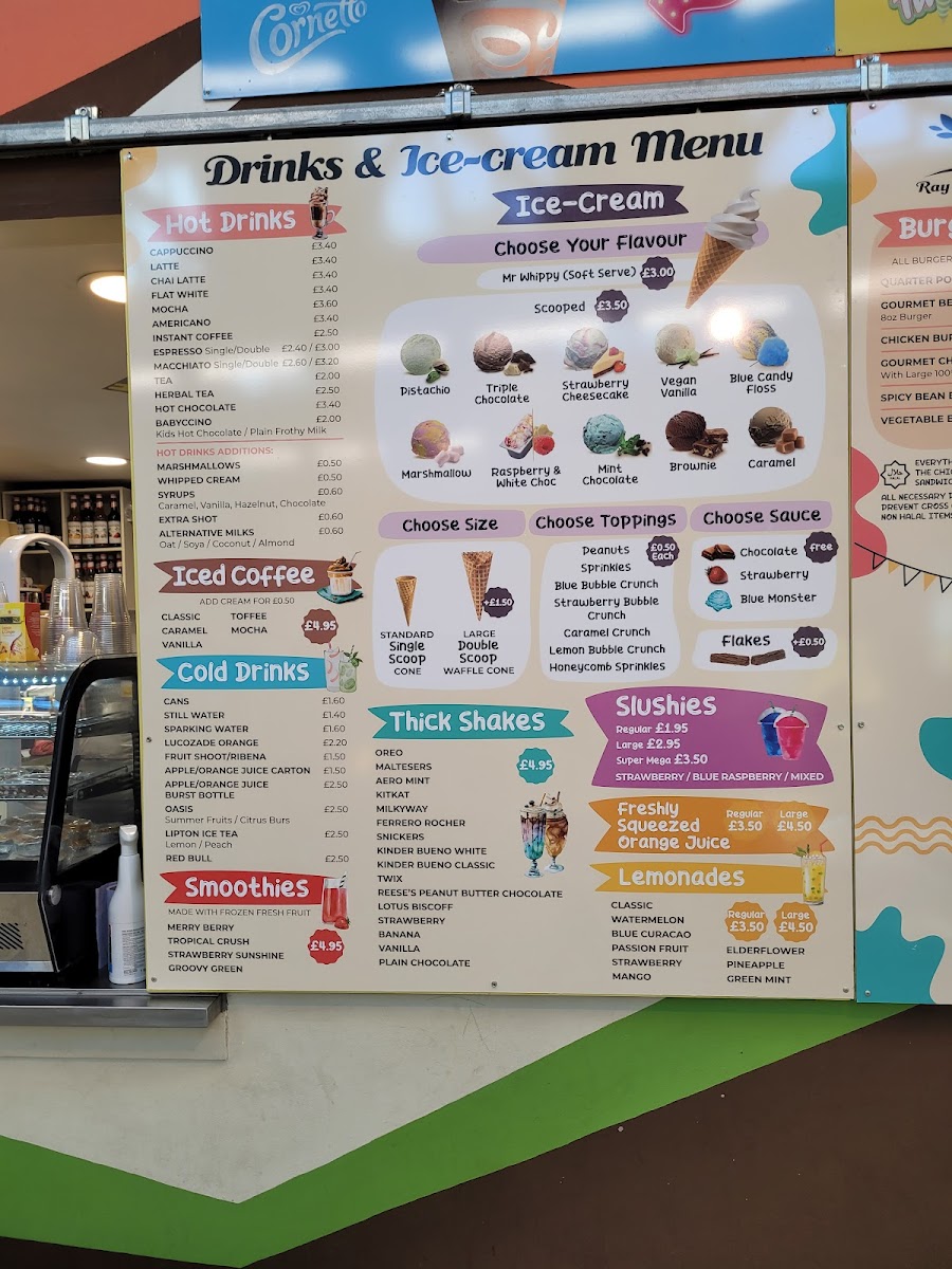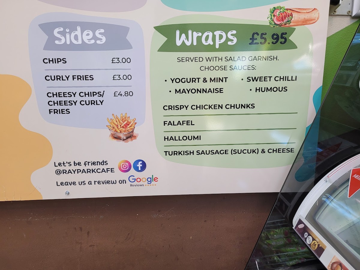 From a reviewer’s perspective, the menu at Ray Park Cafe feels like a well-rounded conclusion to everything you would want from a friendly local café, bringing together comfort food, quick bites, and indulgent treats in one cohesive offering. The drinks selection sets the tone with refreshing Cold Drinks such as Cans, Still Water, Sparkling Water, Lucozade Orange, and Fruit Shoot, alongside vibrant Smoothies like Merry Berry, Tropical Crush, Strawberry Sunshine, and Groovy Green. For those craving something richer, the Thick Shakes-including Oreo, Maltesers, Aero Mint, Kitkat, and Milkyway-add a playful, indulgent edge. Simple café classics shine through the Toast options, from Buttered Toast and Toast With Raspberry Jam / Strawberry Jam / Marmalade / Honey / Nutella to heartier choices like Baked Beans On Toast, Egg On Toast, and Cheese On Toast. Sweet cravings are easily satisfied with Mr Whippy Ice Cream and fruity Slushies in Strawberry and Raspberry. Savoury snacks are well represented with Toasties such as Cheese, Ham & Cheese, Tomato & Cheese, Salami, and Salami & Cheese, mirrored by equally tempting Paninis with the same comforting fillings. Warming Soups-Tomato, Chicken & Mashroom, and Vegetable-lead naturally into satisfying Mains like Falafels, Chicken Kiev, Chicken Escalope, Chicken And Mushroom Pie, and Steak And Kidney Pie. The Burgers section, featuring Gourmet Burger, Quarter Pounder, Chicken Burger, and Spicy Bean Burger, adds crowd-pleasing variety, while the Kids menu keeps things simple and reliable with Chicken Nuggets & Chips, Cheese Burger & Chips, Sausages & Chips, Fish Fingers & Chips, and Hot Dog & Chips. Coffee lovers are well catered for with Hot Drinks such as Cappuccino, Flat White, Mocha, Instant Coffee, and Espresso Double, complemented by Frappe Iced Coffees in Classic, Vanilla, Caramel Toffee, and Mocha. Finally, the menu rounds off neatly with flavourful Wraps like Turkish Sausage (Sucuk) & Cheese and Crispy Chicken Chunks, plus familiar Others including Latte and Americano, making the overall menu feel complete, approachable, and thoughtfully balanced.